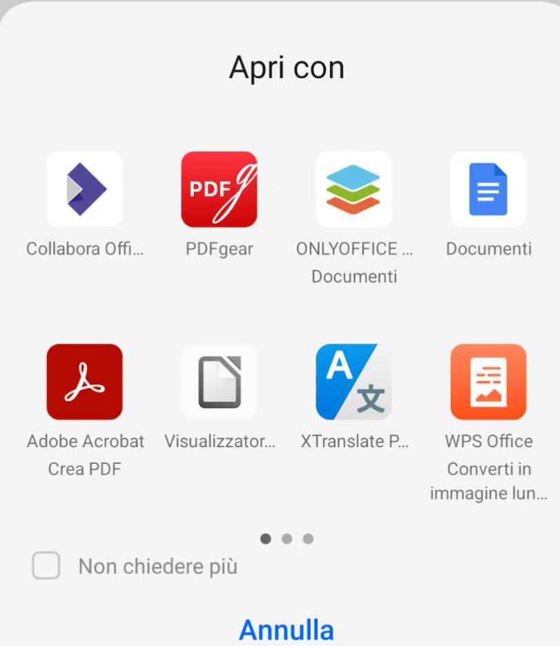 Vediamo come convertire un file .docx , cliccandolo da WhatsApp: si presenta il classico menu “Apri con”: