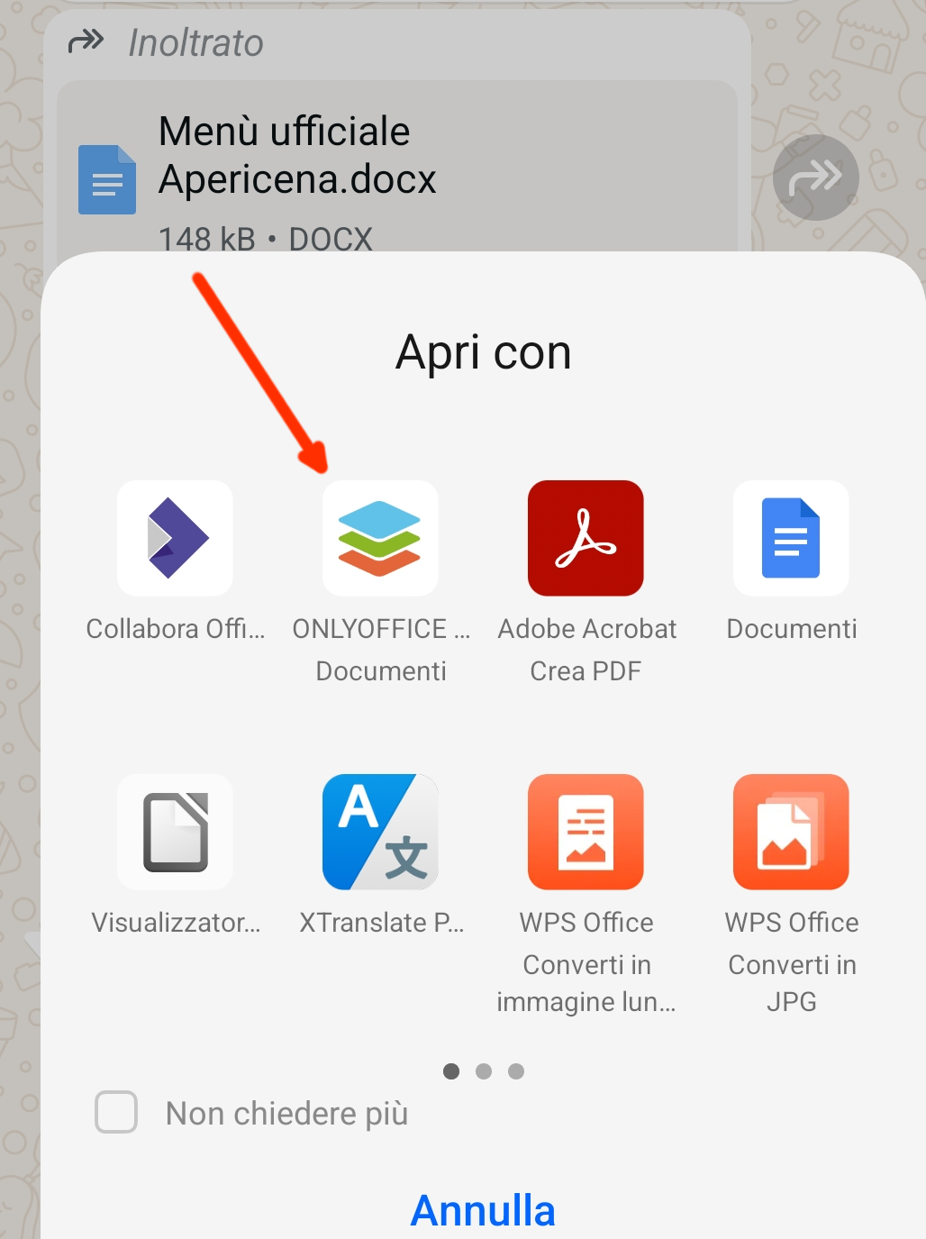 Dopo aver cliccato sul documento da aprire (in WhatsApp o su una pagina o una mail), scegliete OnlyOffice: e vedrete il documento desiderato.