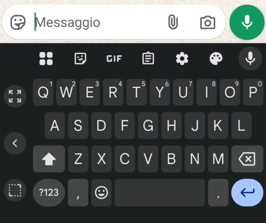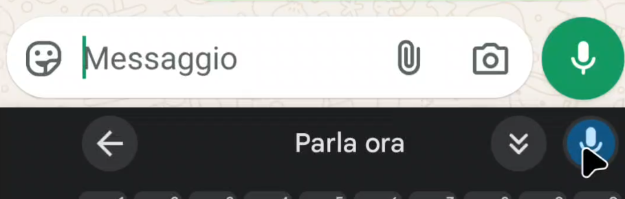 Ecco nella figura qui sotto la tastiera su WhatsApp. Su altri telefoni può apparire leggermente diversa. Il microfono verde c’è sempre (ed è quello che usate per i vocali).