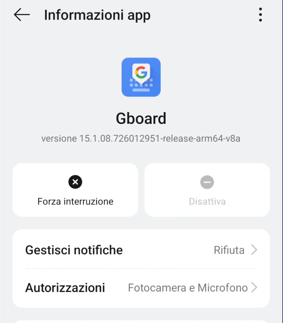 Cliccate su Gboard e in questa schermata cliccate su Autorizzazioni: