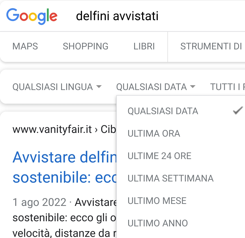 Vai a destra, vicino alla casella di ricerca, e trovi la voce “Strumenti” (può essere anche “Strumenti di ricerca” o addirittura “Utensili”, una brutta traduzione di “Tools”). Lì puoi scegliere “Qualsiasi data”, “Ultima ora”, “Ultime 24 ore”, “Ultima settimana”, “Ultimo mese”, “Ultimo anno”.