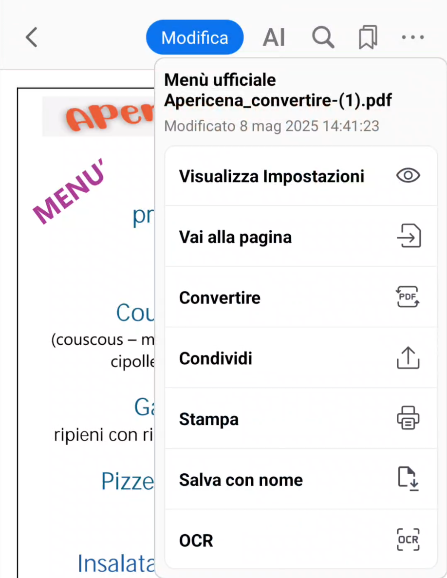 …poi, tornerete a vedere il file, ma è diventato un PDF. (C’è un nuovo tasto Modifica e altri).