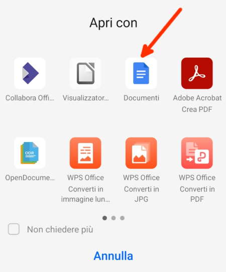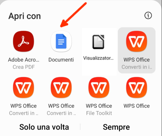 Ci possono essere anche icone di altre App, ma voi scegliete Documenti (vedi la freccia). Nell’esempio vedete le due scritte “Solo una volta” e “Sempre”.