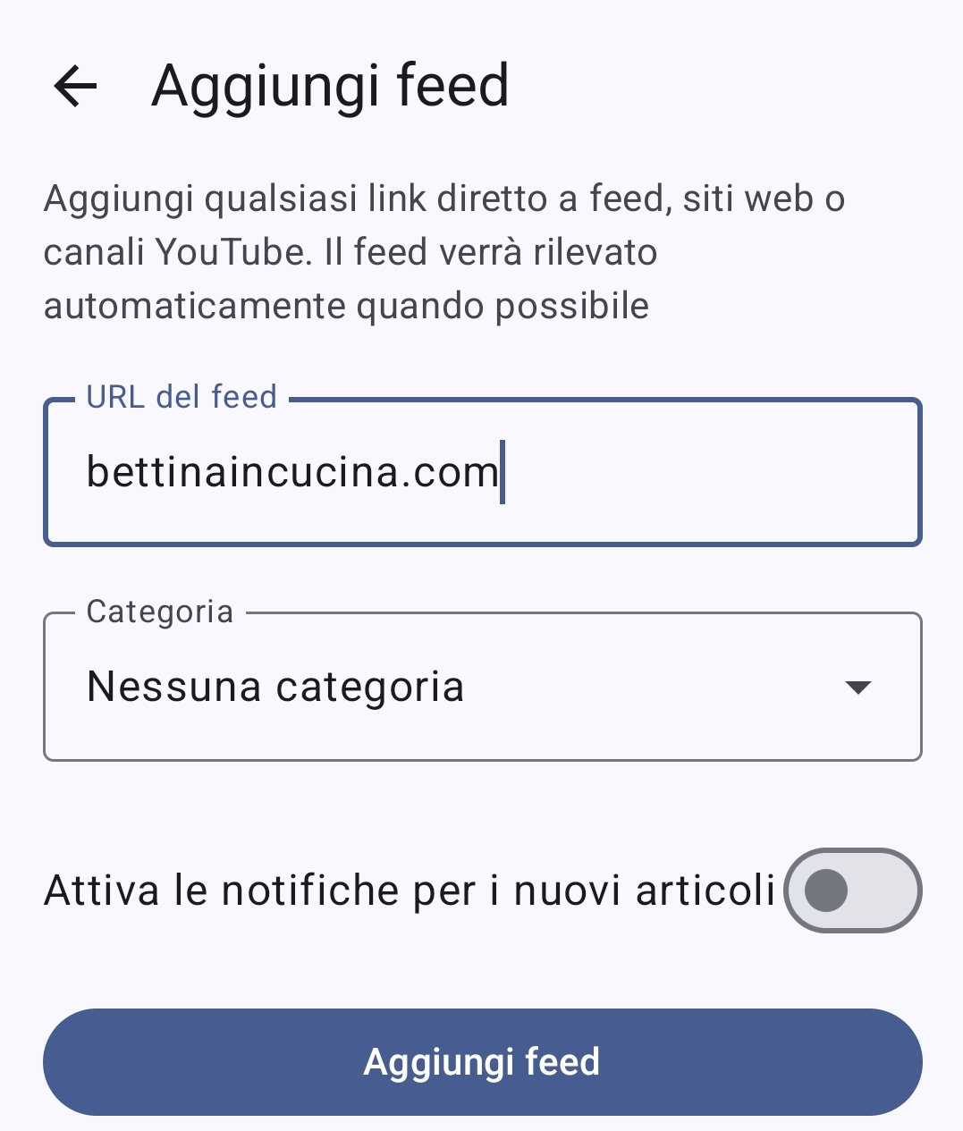 Inserisci bettinaincucina.com e - se vuoi - seleziona anche in questo caso “Attiva le notifiche” e poi premi Aggiungi feed