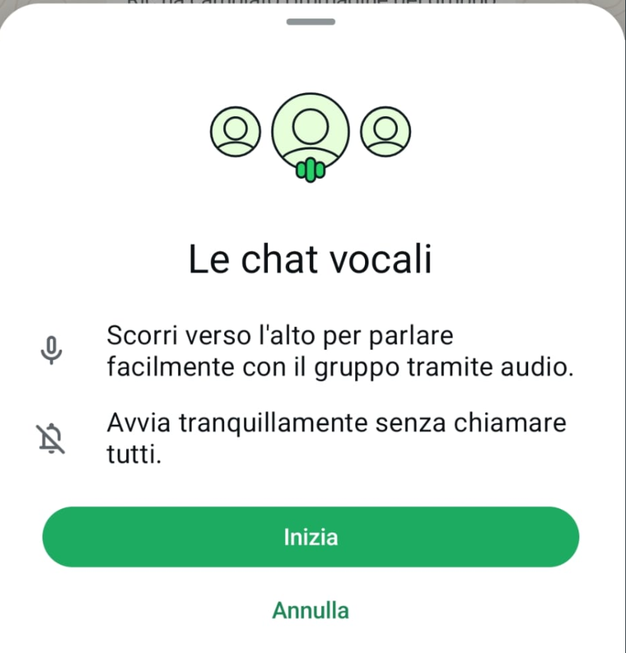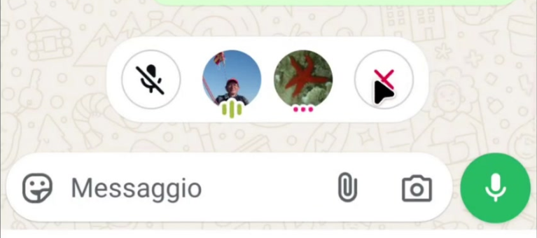 Una chat vocale è diversa da una telefonata di gruppo (che si può attivare nei gruppi piccoli premendo l’icona della la cornetta in alto, accanto all’icona della telecamera).